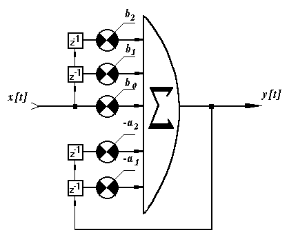 Устройство реализующее цифровой фильтр выполняет последовательное умножение входной и/или выходной выборки сигнала на коэфициенты фильтра и сложение полученных произведений. Структурная схема рекурсивного цифрового фильтра 2-го порядка показана на рис. 1.