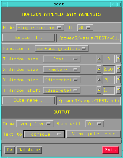 User can input window dimensions in discrete or in units used in current direction. (In X and Y directions - meters, in T direction - milliseconds). When data (cube in 3-D variant or one of horizons in 2-D variant) is loaded, PCRT will automaticly recounts values in window dimension text fields when clicking on unit option menus according to the real project values (for example when X OGT step is 50 meters value "3" in X Window size text field will be replaced by "150" when meters unit in the current option menu will be chosen.