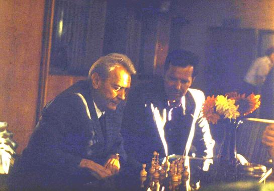 Г.С. Поспелов и словацкий коллега Гливиак на границе между Румынией и Болгарией играют в шахматы